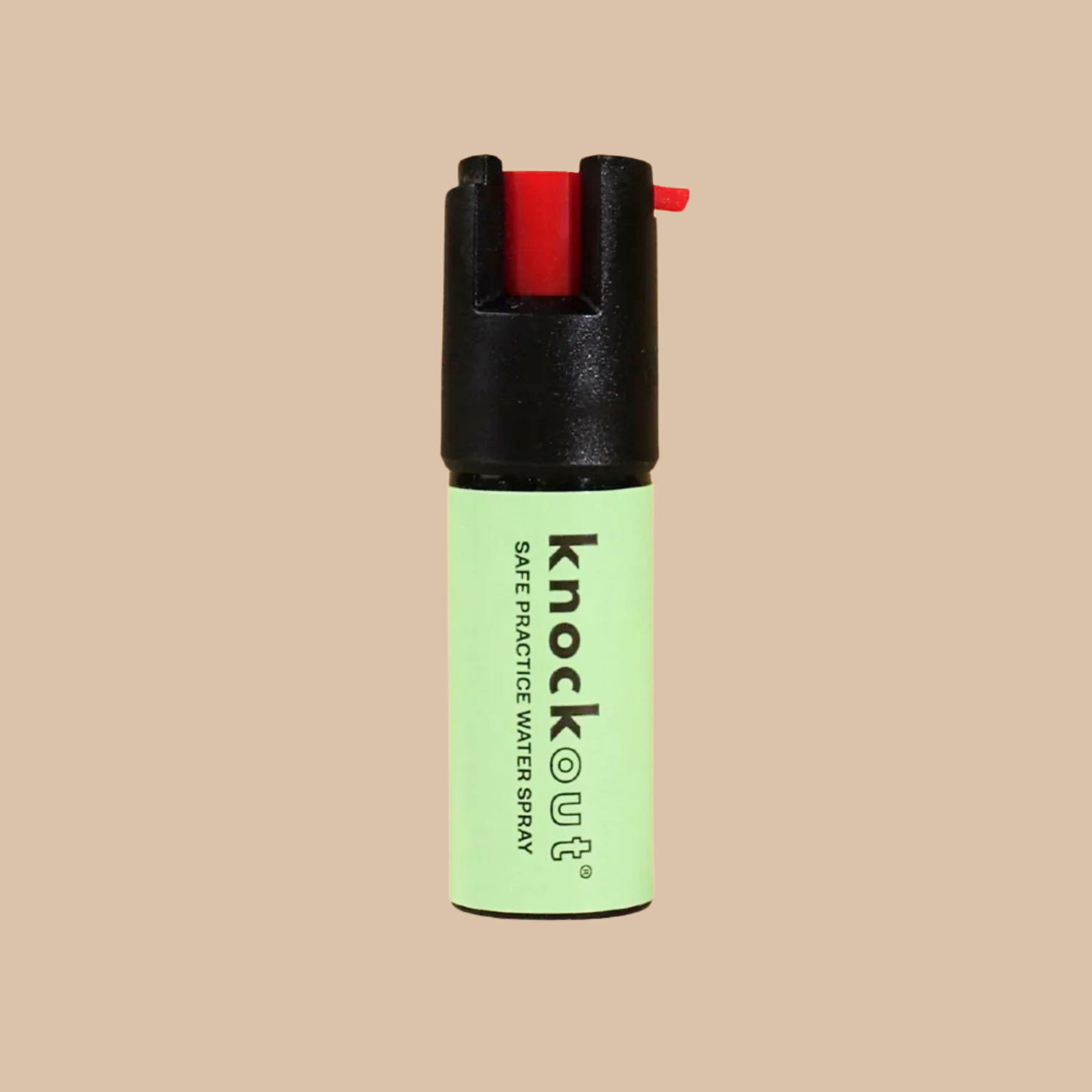 Place this water spray canister into your Knockout pepper spray case to practice flipping the lock and pressing down on the spray button. Get comfortable with how it feels to use the spray, so you're prepared if you ever need to use the pepper spray.